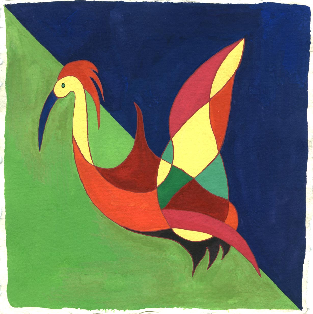 Untitled (subject: semi-abstract bird figure from the tale ‘Bird of Fairyland’) Lithograph reproduction of original with coloured inks on paper by Rabindranath Tagore Museum No: IS.78-1961 Source: V&A Museum