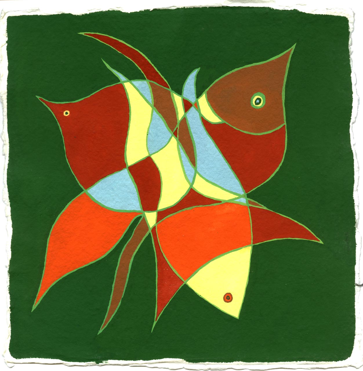 In the two paintings of mine (Aurogeeta, Figs. 4&5) that resemble fish rather than birds, it is the sinuousness of water that blends into the fish form.